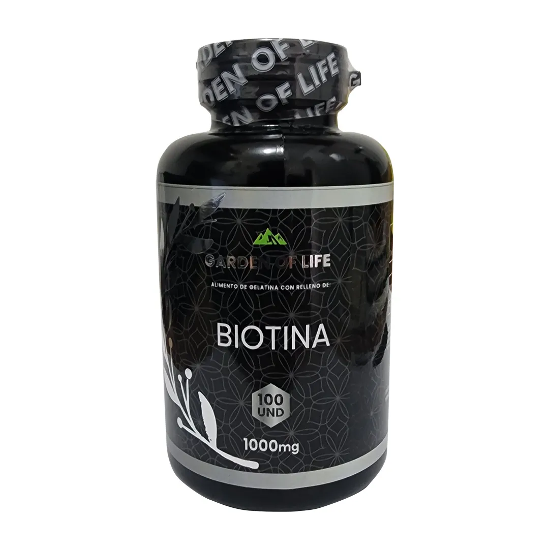 Especificaciones del Producto La Biotina Garden of Life viene en un envase de 100 c psulas de gel suave cada una con una alta concentraci n de 1000 mg Este suplemento es ideal para promover el crecimiento y fortalecimiento del cabello la piel y las u as adem s de apoyar el metabolismo de los nutrientes La dosis recomendada es de 1 c psula diaria Producto registrado bajo el INVIMA NSA 0017664 2024 lo cual asegura su calidad y seguridad para el consumo Usos Principales Fortalece el cabello y previene su ca da Mejora la salud de las u as Promueve una piel m s saludable Apoya el metabolismo de carbohidratos grasas y prote nas Contribuye a la regeneraci n celular Pol tica de Devoluciones y Garant a Para devoluciones por garant a el cliente debe cubrir el costo de env o de regreso a la bodega de origen Los gastos de env o no son reembolsables y si el env o se realiz por cobrar este costo ser deducido del reembolso La mayor a de nuestros productos cuentan con una garant a de 10 d as a partir de la fecha de entrega Pasado este plazo no se ofrece garant a Art culos de uso personal y suplementos alimenticios no aplican para retracto de compra La garant a no cubre da os por golpes humedad modificaciones uso inadecuado o descuido en el manejo del producto En caso de recibir el producto da ado abst ngase de usarlo y cont ctenos de inmediato para una soluci n efectiva Para iniciar una solicitud de garant a por favor comun quese con nosotros a trav s de nuestro correo electr nico y nuestros asesores le asistir n en el proceso