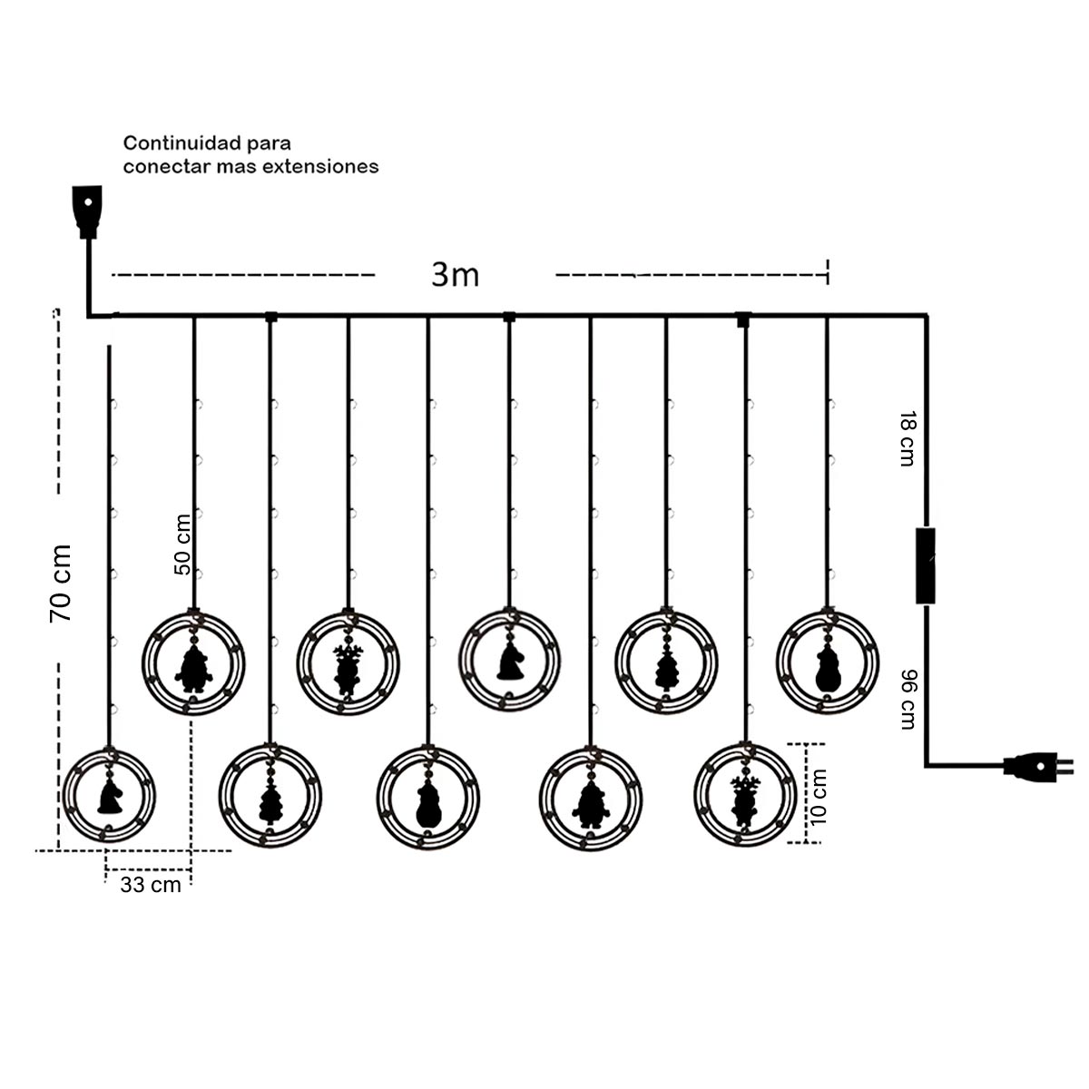 - Tamaño Aprox.: Largo: 3 m / Cantidad de tiras: 10 tiras / Caída de la tira: Larga: 70 cm – Corta: 50 cm / Cantidad de luces: 100 LEDS. / Distancia entre tiras: 33 cm.